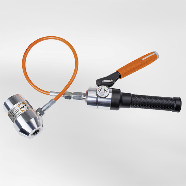 Description: Elastic hydraulic hose for almost unlimited applications, e.g. in the equipped control cabinet with limited space conditions 2 Precisely tuned pressure relief valve protects against damage to the cylinder 3 Reinforced, comfortable soft-touch handle to prevent slipping Balanced transmission ratio in the hydraulics for power-saving application 5 Heavy-duty aluminium design for reduced weight at just 2 kg 6 Roller-finished, particularly smooth cylinder running surfaces protect against wear – even under heavy loads 7 High punching force 75 kN